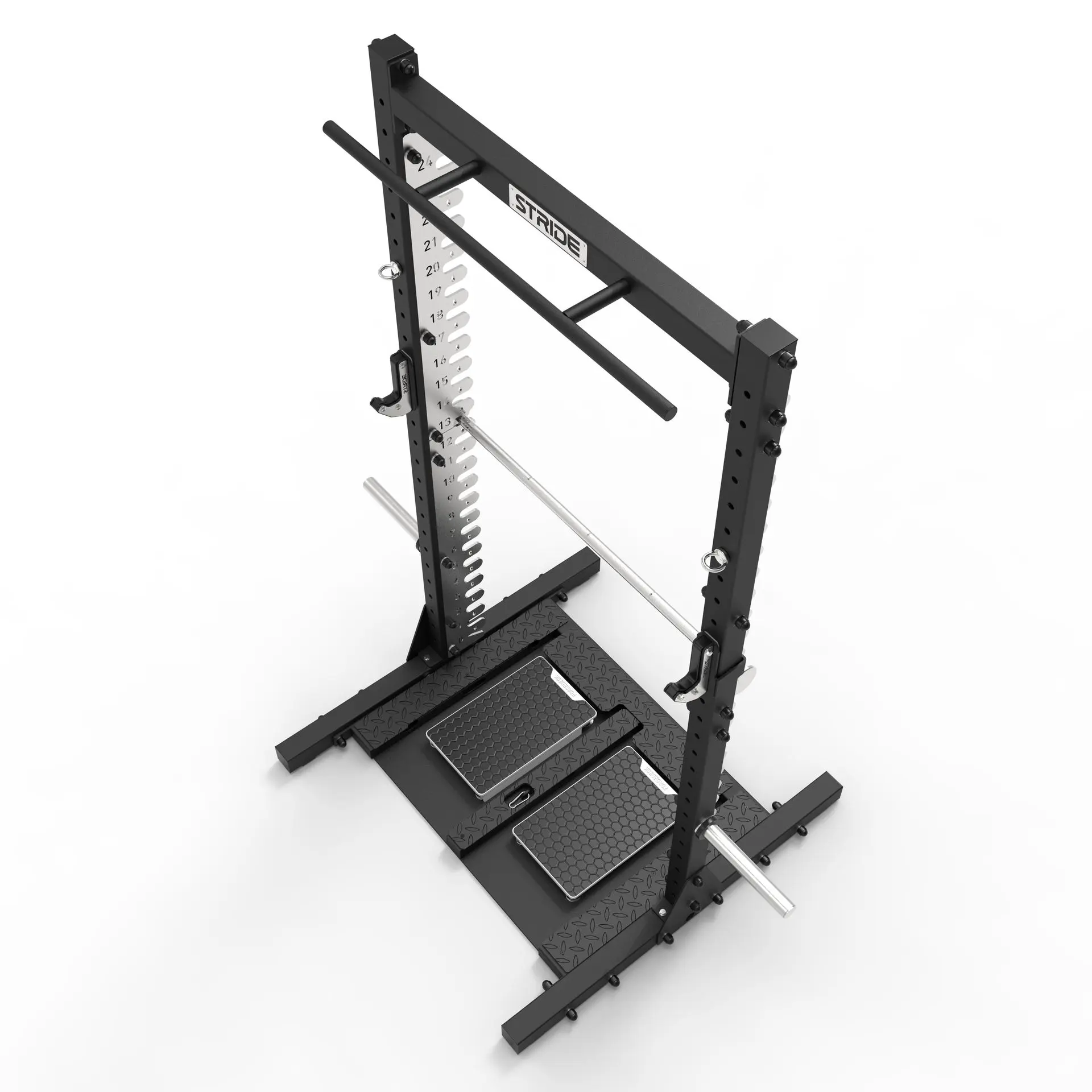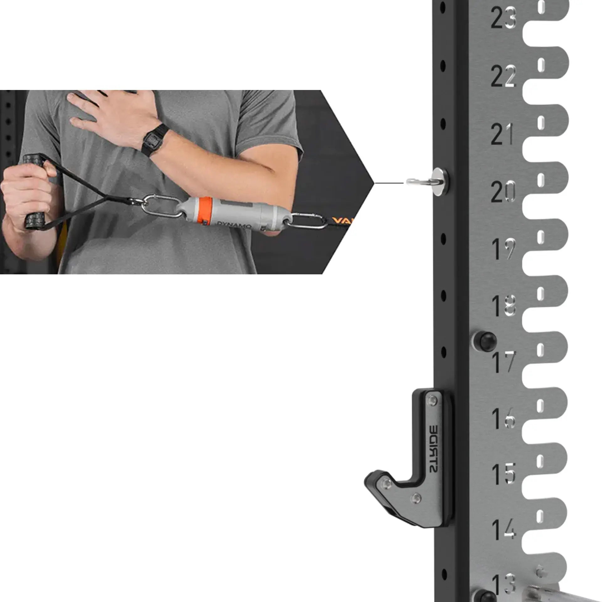 We integrated adjustable pins that you can position anywhere on the rack, making it the ideal setup for a wide range of DynaMo exercises from VALT. This added flexibility turns the rack into a fully adaptable training station tailored to your needs.